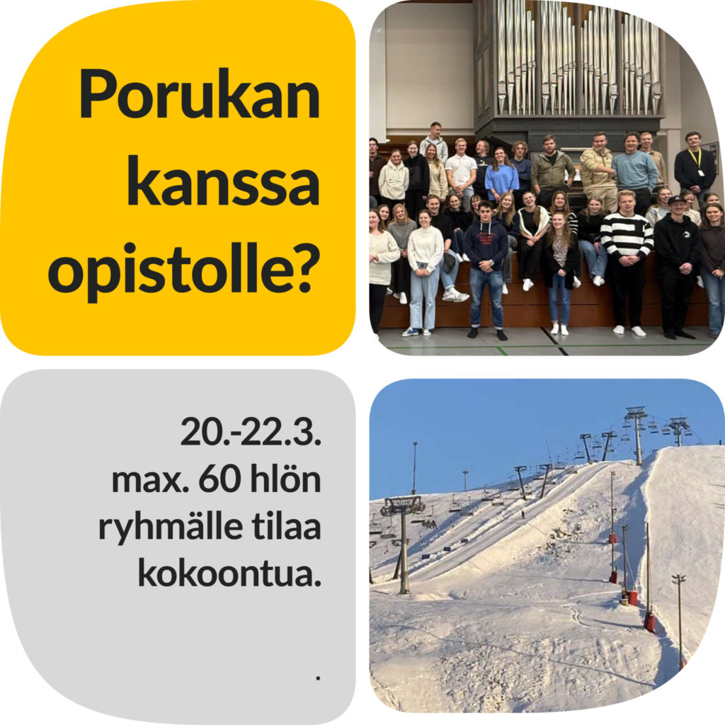 Kurssin peruuntumisen vuoksi 20.-22.3.2026 opistolla tilaa kokoontua (max. 60 hlöä) joko kurssin tai vapaamuotoisemman leirin muodossa.