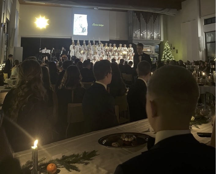 Perjantaina saimme viettää ensimmäistä juhlaamme opistolla, adventtipäivällistä. Työtehtävät oli jaettu kaikille linjoille niin, että kaikille löytyi jotain hommaa. Teknisten taitojen linjan opiskelijat kantoivat pöydät saliin, Yrittäjyyden opiskelijat koristelivat lavan, Luonnontieteen ja Musiikin opiskelijat hoitivat tiskin ja Viestinnän väki koristeli ja kattoi upeasti kaikki salin pöydät. Kielilinja ja Kansainvälisyyslinja esittivät meille ihanan Lucia-esityksen. Kotitalouden opiskelijat tekivät suuren työn ja loihtivat meille maittavat ruoat pöytään. Tarjolla oli monenlaisia salaatteja, kinkkua, karjalanpaistia sekä suussa sulavaa puoloffee-jälkiruokaa. Tilaisuus oli juhlava.